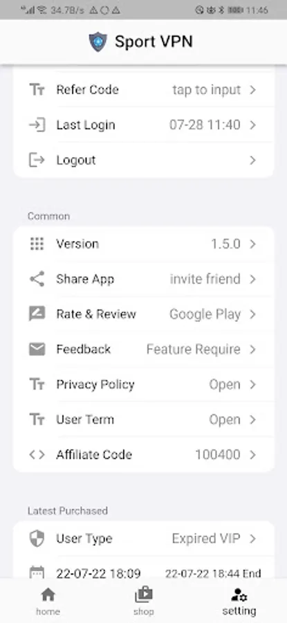 ✩ More traffic? Share app and let new one input you refer code. Every One has an Affiliate Code. Usage: Share app and let new user input your code in menu "Setting -> Refer Code". Both referer & referee can reward extra 1GB traffic monthly FOREVER. Limit UP TO 10GB monthly.