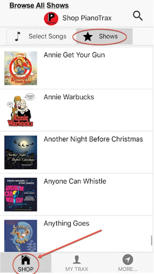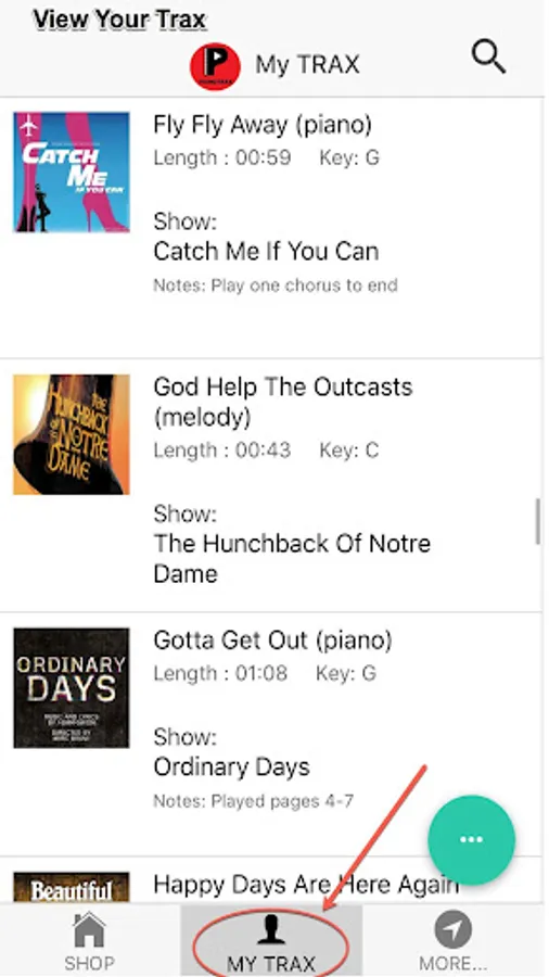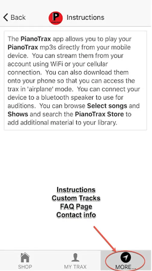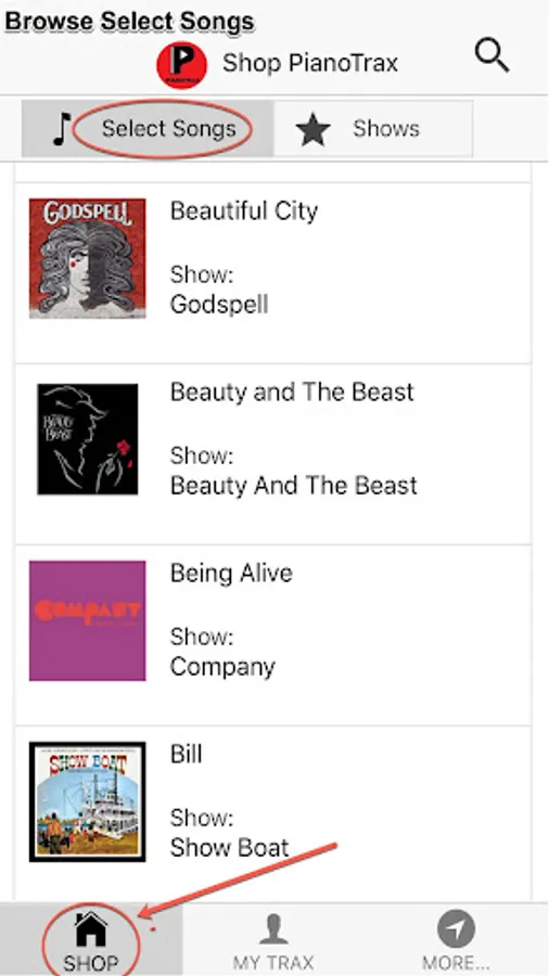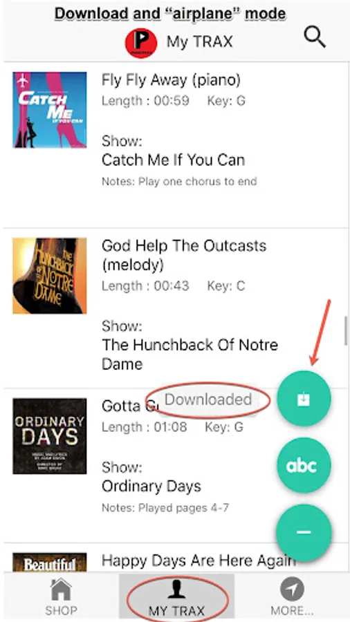 The PianoTrax app allows you to play your PianoTrax mp3s directly from your mobile device. You can stream them from your account using WiFi or a cellular connection. You can also download them onto your phone so that you can access the trax in "airplane" mode. You can connect your device to a bluetooth speaker to use for auditions. You can browse Select Songs and Shows and search the PianoTrax Store to add additional songs to your library.