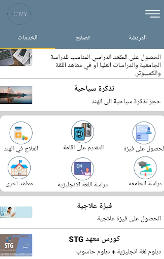 (In this service all you need to do is to select the area you want to travel to and then the specific destination to travel such as choosing the name of the institute, the name of the university, or the type of treatment you are looking for. If you want to study, we will suggest the best scientific facilities whether institutes or universities and we will attach you the prices, tuition and cost of living in the desired area and everything else you need to know, but if the purpose of treatment we will require a set of documents and treatment reports and we will extract a treatment plan explaining the full cost and duration of stay Required As for the tourist visit we will propose several areas you can visit and we will arrange everything for you from A to Z. Finally for traders we can provide all the items to be traded from India such as spices, medicines, fabrics, food, electrical and mechanical materials, medical equipment and many other market requirements We provide you with prices, varieties and samples.