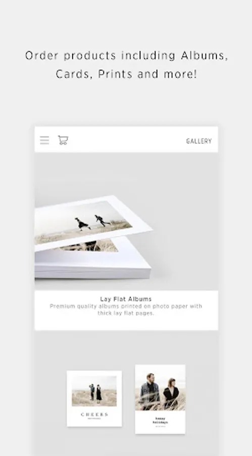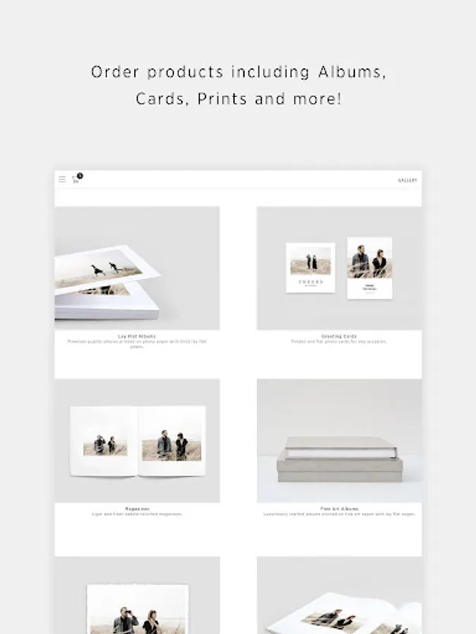 Our extensive collection of printed products including Albums, Greeting Cards, Prints and more are available straight from the gallery and can be edited and ordered through your phone.