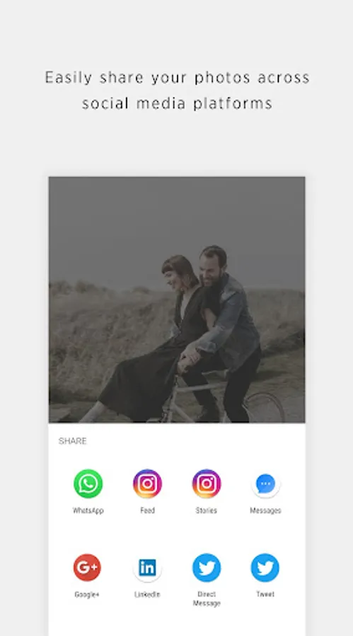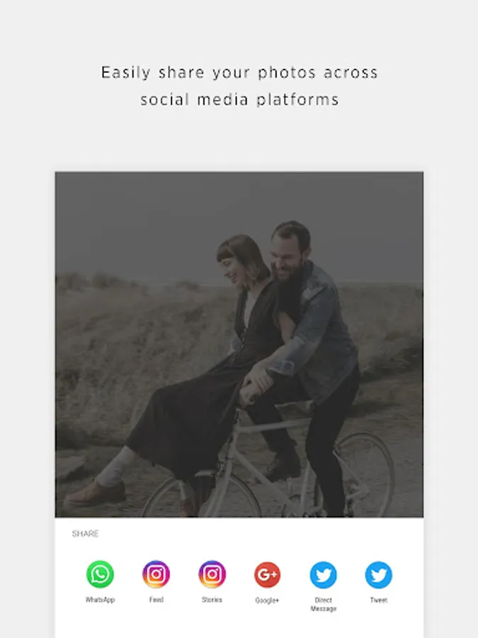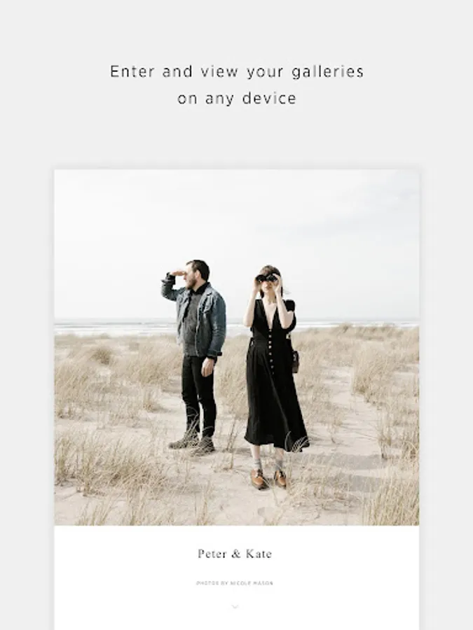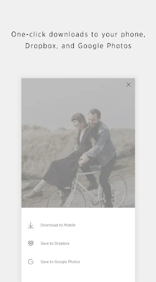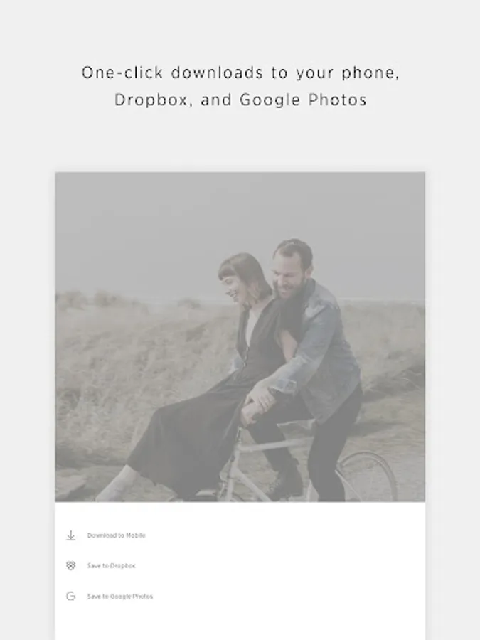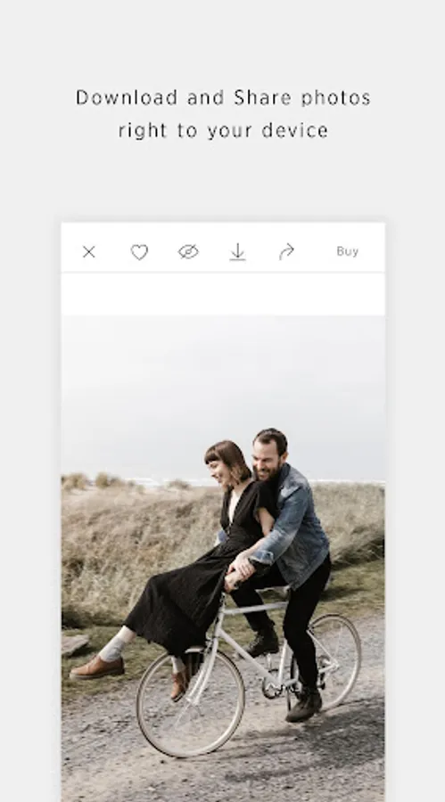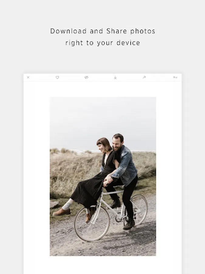 With our simple and clean interface you can easily download individual images, a set of favorites or your whole gallery with just a few clicks. Sharing is enabled, using inbuilt options from your phone, meaning you can directly share your photos via your social media apps.