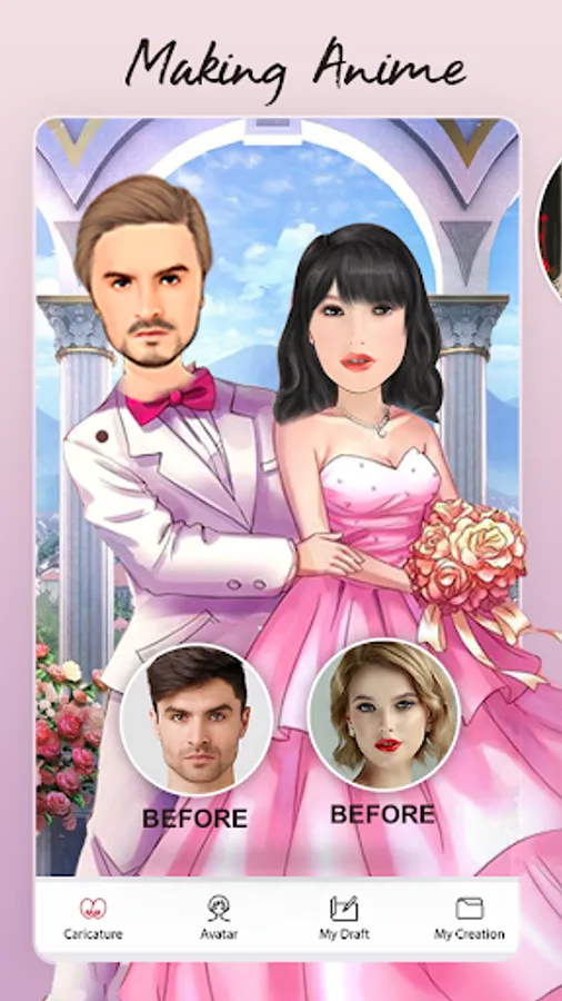 The app provides a selection of beautiful characters that can be used as a starting point to create your own personalized caricature poster.