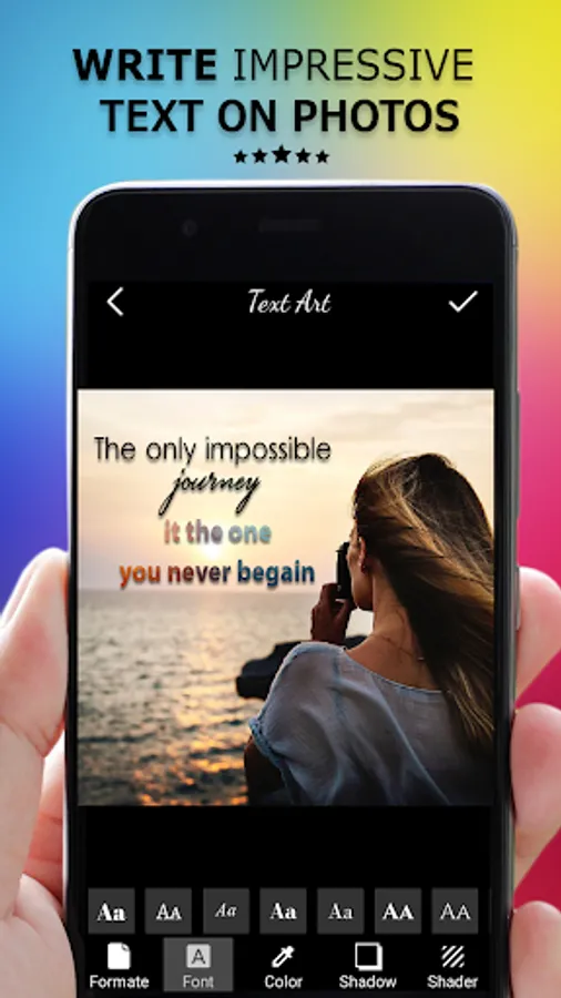Write beautiful and impactful text on photos by this text editing app.For creating alasting impact, modify word's formats and highlight important words of sentences (punch words).