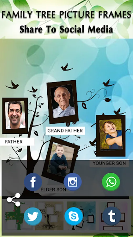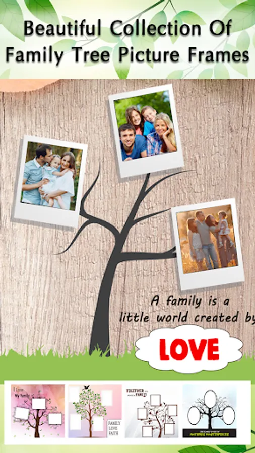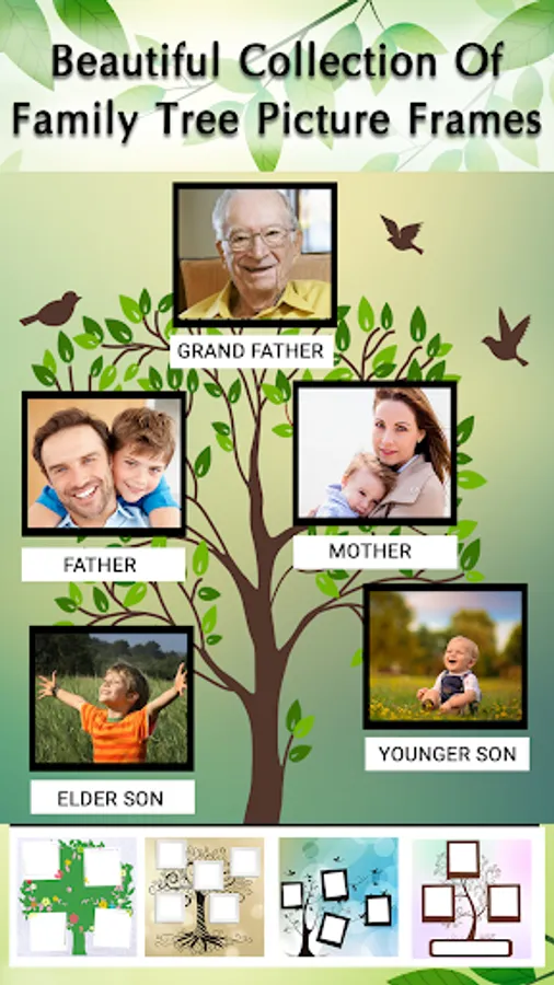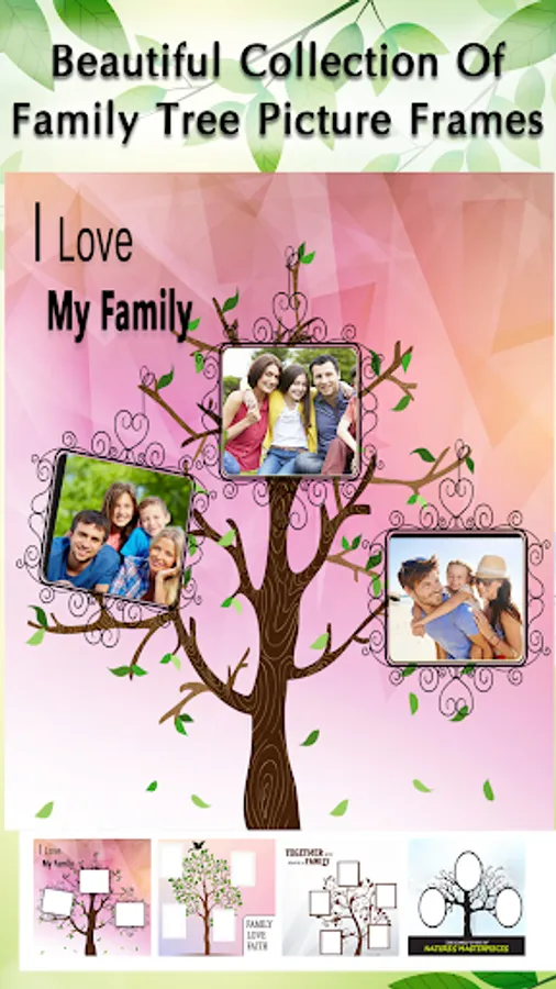 Family Tree picture frames allows to make latest and creative family tree of your photos! Create a fabulous ancestry by combining ordinary photos with family tree picture frames application. Syndicate your family memories at one place with our unique family tree maker and adore via photo editing effects.