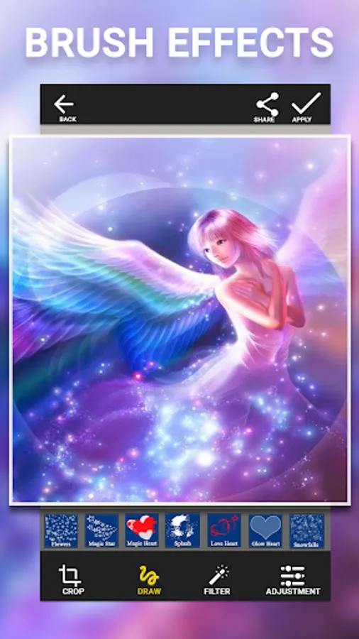 Photo art snap effects provides custom artistic effects for your image.Import image from gallery and touch or move finger on image to get artist effect and transform ordinary photo into artistic work. Move your finger on image and get fog, smoke,bubble, fire, star and lots of magic snap effects for your photos. You can also edit image with best photo editor tool to enhance image accordingly.