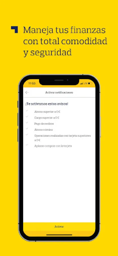 Because we know how much you value your time, we want you to be able to do your transactions without going to the bank. Use Mobile Banking and forget about unnecessary waiting. Check your account movements whenever you want, make immediate transfers or manage your direct debit receipts. Keep your cards under control: review the payments you make, postpone operations, set the maximum withdrawal amount and purchases, turn it off, turn it on, block it or request a new one, when you need it.