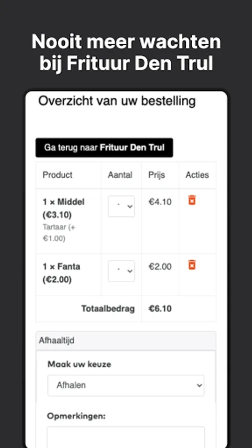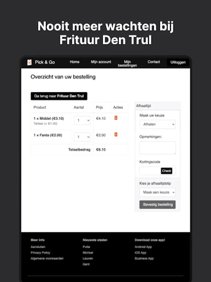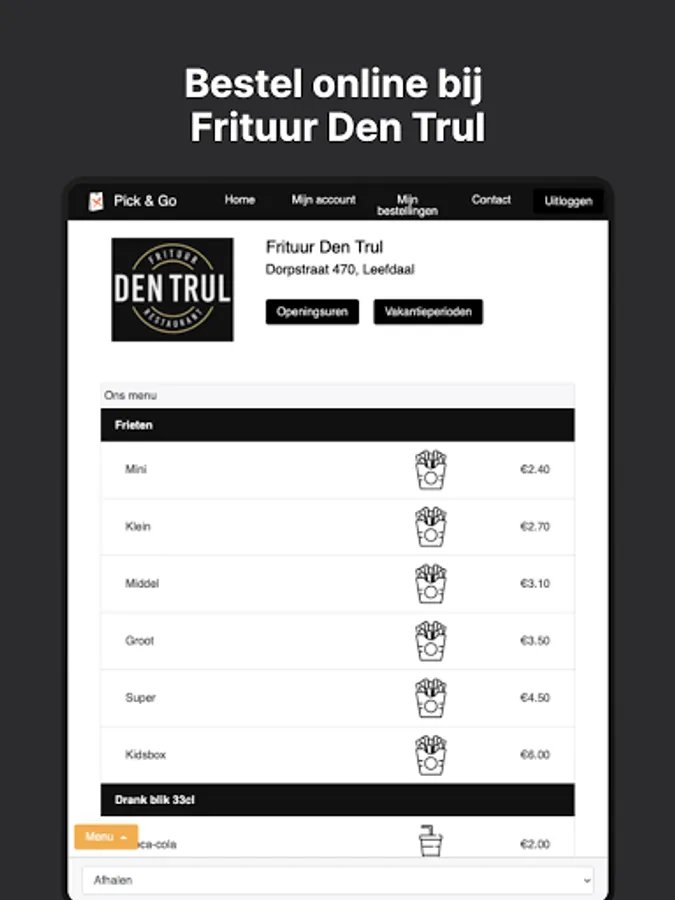 Never wait in line again with Friterie Den Trul! Place your order via our app and pick it up at the chosen time.