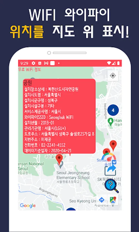Provides nationwide free Wi-Fi information (installation location, service provider, etc.).