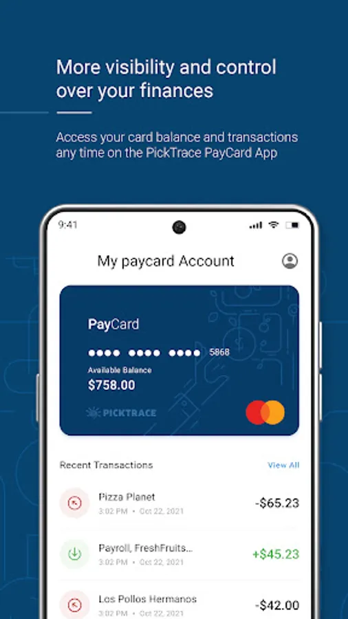 Easily and securely access your finances with the PickTrace PayCard App. You can view your card balance and transaction history.