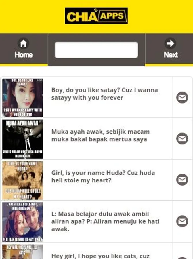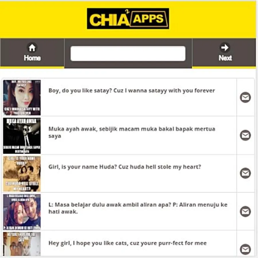 Chia2 Apps is one of the products developed by killjols. Merging Pickup Line Best of Malaysia together with Malaya search and sharing functions for user convenience. All source images and text taken from social media, twitter and facebook.