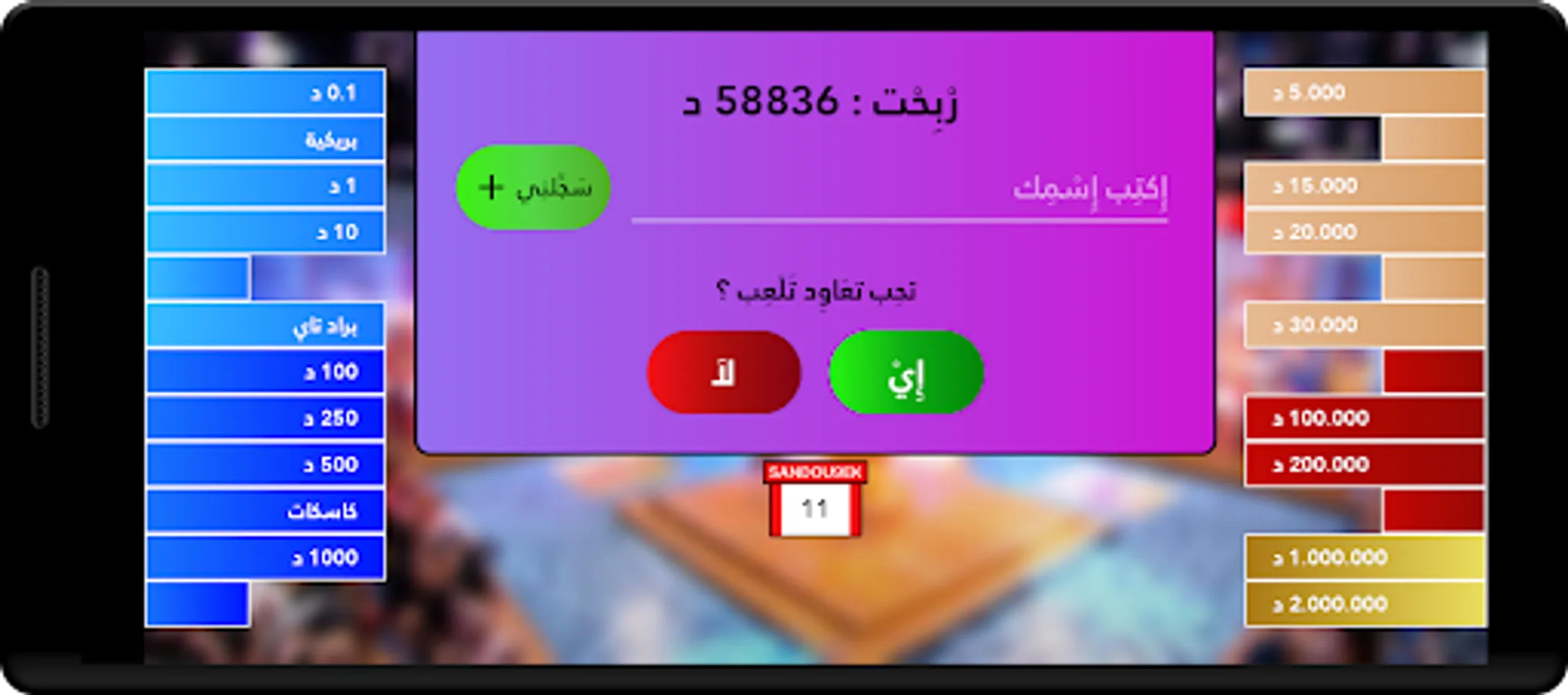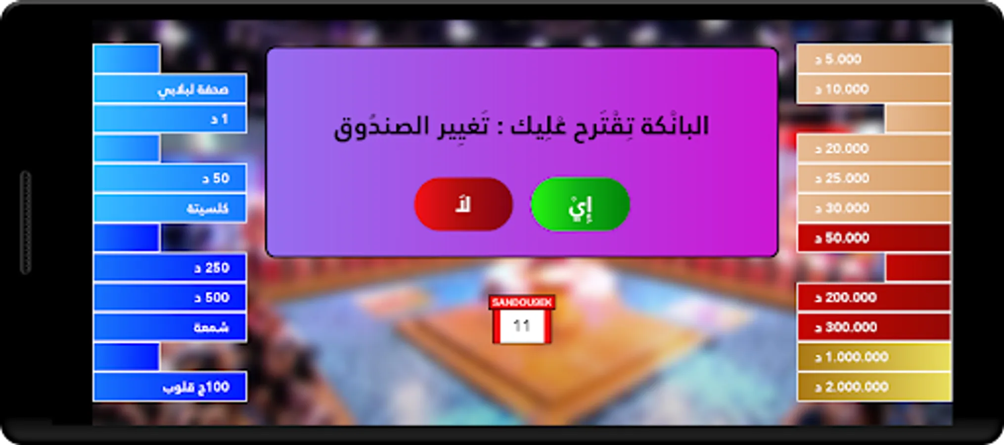 The Dlilek mlak 2022 game principle: Each player has a box (Sandouk) which contains a determined sum of money (up to two billion Tunisian millimes) or objects. At the start of the Dlilek Mlak game, the player chooses his box (Sandouk) then eliminates the other boxes, and regularly receives calls from the banker who offers to exchange his (Sandouk) with another or a sum of money.