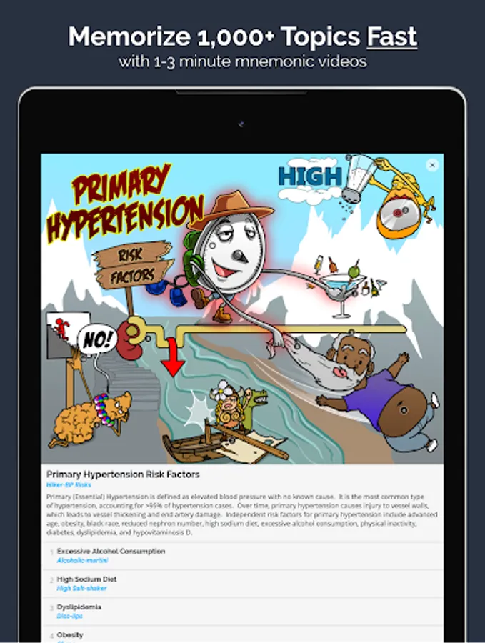 Hundreds of entertaining 3-minute picture mnemonic video + quiz lessons covering the most important key facts in science. Used by over HALF A MILLION STUDENTS in university pre-health programs and Medical, Nursing, PA, NP, PT, OT & PharmD colleges world wide.