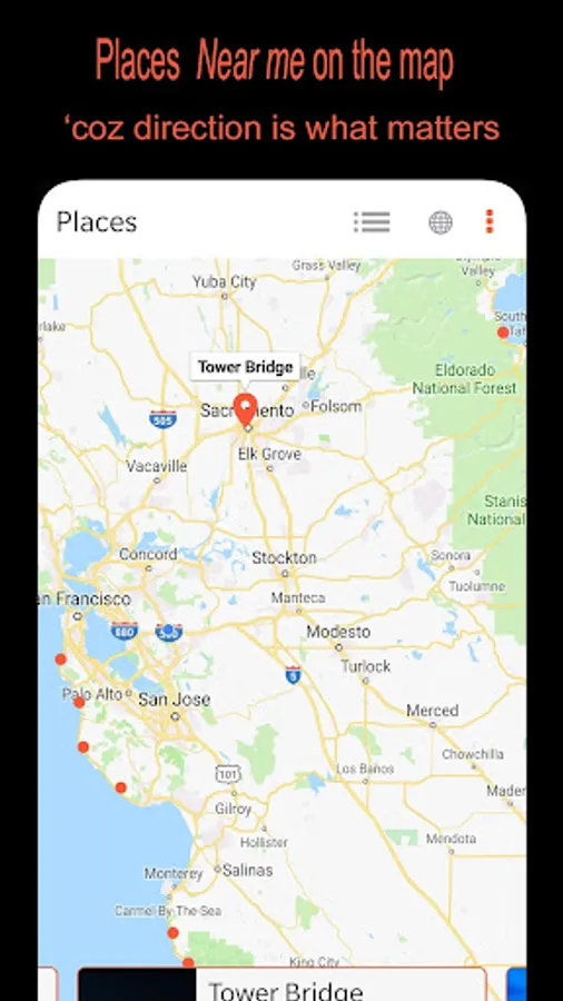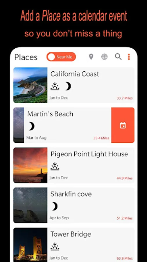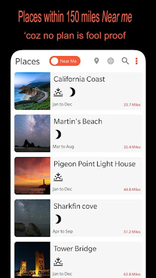 4. Presorted view of list of ‘Places’ within 150 miles, along with map view for instant plans.