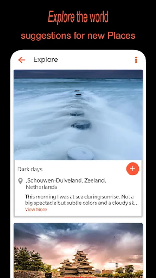 8. Explore new places (photo and location along with feedback/suggestions from the photographers who have uploaded them to Flikr) from all over the world and add them to your list. Explore images/places are based on your photography “Interest” (category) selection in Profile and change accordingly as and when you update your Profile with new “Interests”. The list of places you see is refreshed every time you visit the screen, so there are new options for you to peruse.