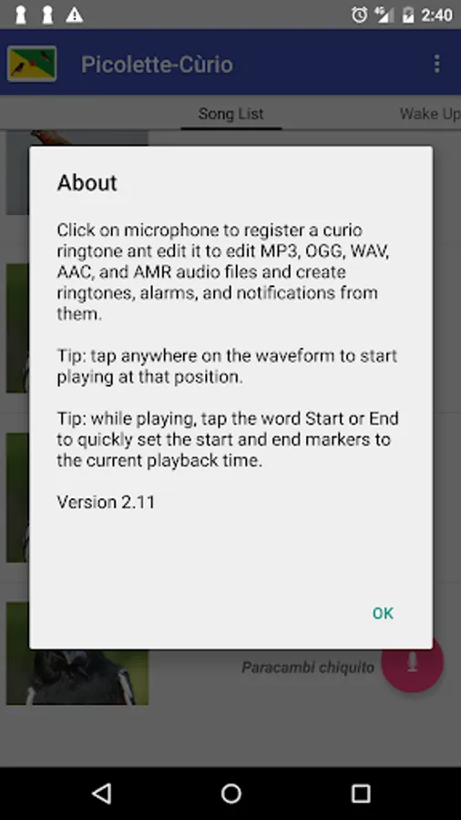 Picolette-Cùrio identifies nearly every songs of Picolettes (Cùrio) throughout Latin America. With this application, you can teach to your bird to sing different songs :