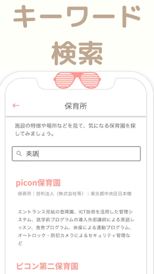 "Easy nursery school search app picon" is a kindergarten hunting app that allows you to search, display information, and make inquiries about the nursery school you need to find a nursery school.