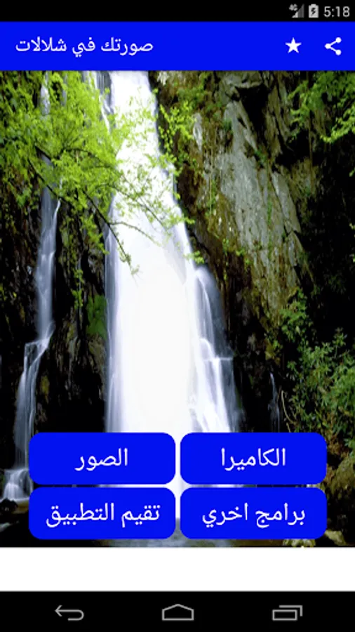 ضع صورتك مع اجمل شلالت العالم محموعة من اجمل واشهر الشلالات! إذا كنت من محبي الطبيعة وتريد وضع صورتك في إطارات من صورالشلال هذا التطبيق سيكون المفضل لديك! تبقى لكم ذكريات عزيزة في قلبك وعقلك،