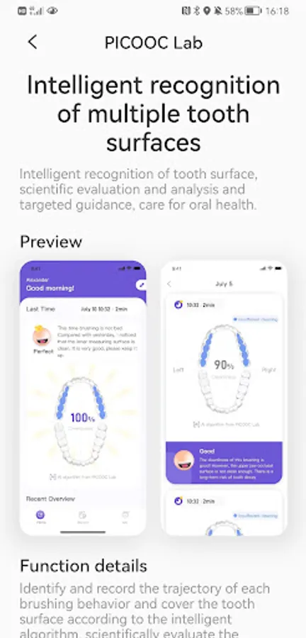 Intelligently identify 16 tooth surfaces, monitor the brushing behavior, find the problem of incomplete cleaning of the tooth surface, and timely remind to improve the cleaning of the corresponding areas.