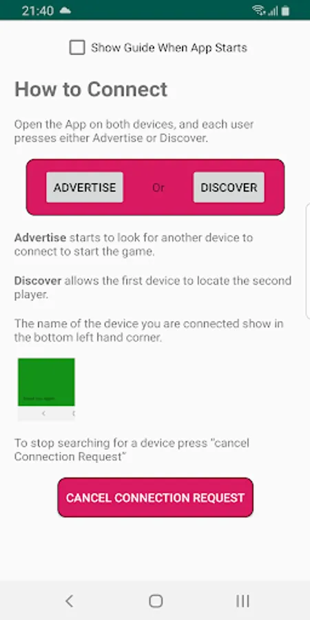 One person “advertises” and the second “discovers” once pair the device will pass the cards between the two devices to ensure no duplicate cards are dealt and each user can see which card has been put done but not the other persons hand.