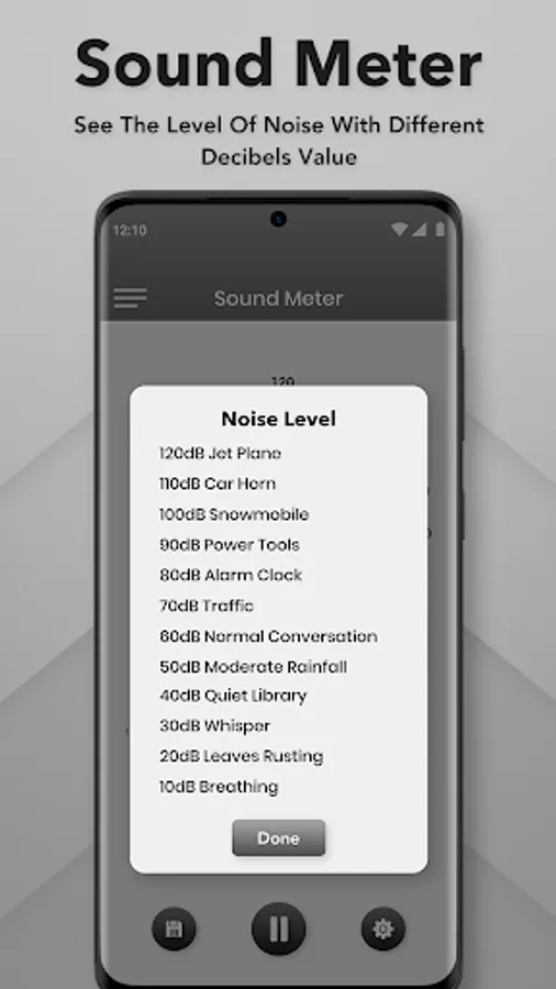 Sound Meter PRO - Best Decibel Meter is professional Decibel Meter for your Android. Sound Meter is also known as sound level meter and decibel meter (dB meter). Sound Level db uses your Android's microphone to measure levels of noise or sound pressure levels and displays measured data in dB (decibels) with reference to generally known noise or displays the noise data on easy to read graph for the last 30 seconds of app use.