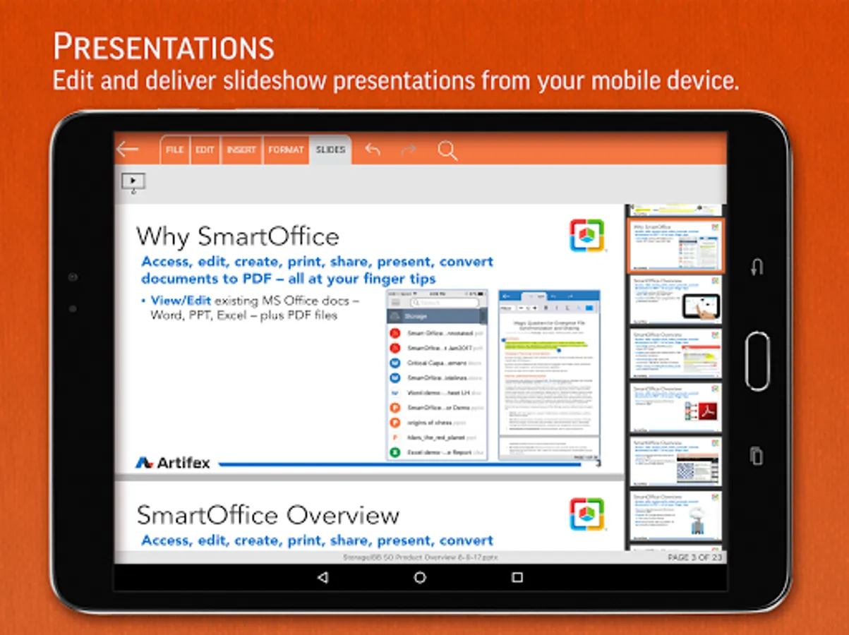 •Slideshow: present directly from a mobile device or through a projector