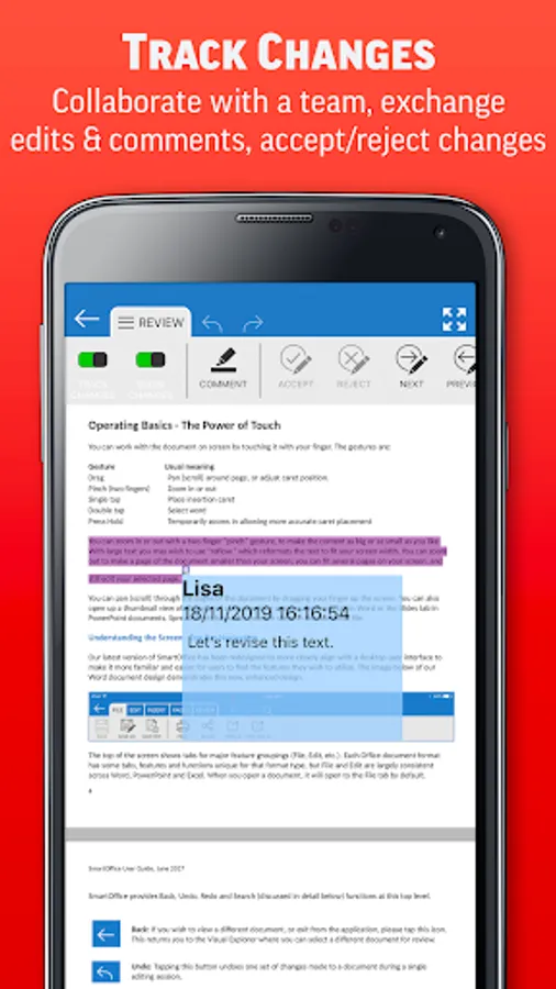 •Track Changes: add & view comments, view change summaries, accept/reject changes, highlighted changes