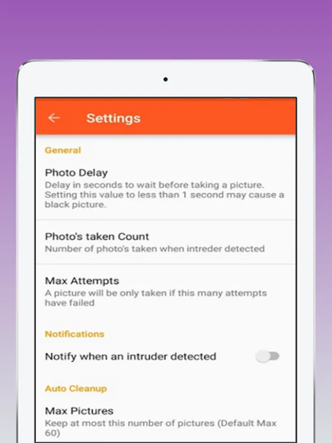 1. The app automatically takes a photo while someone enters the wrong PIN, Pattern or Password.