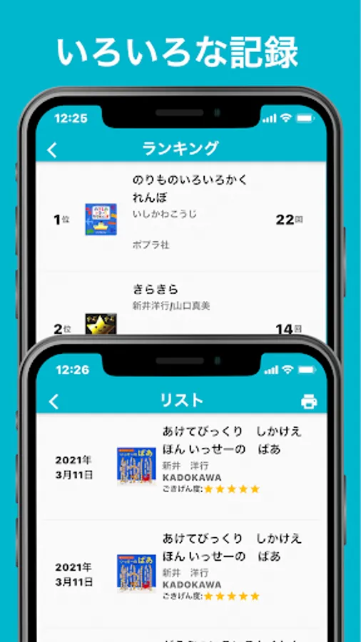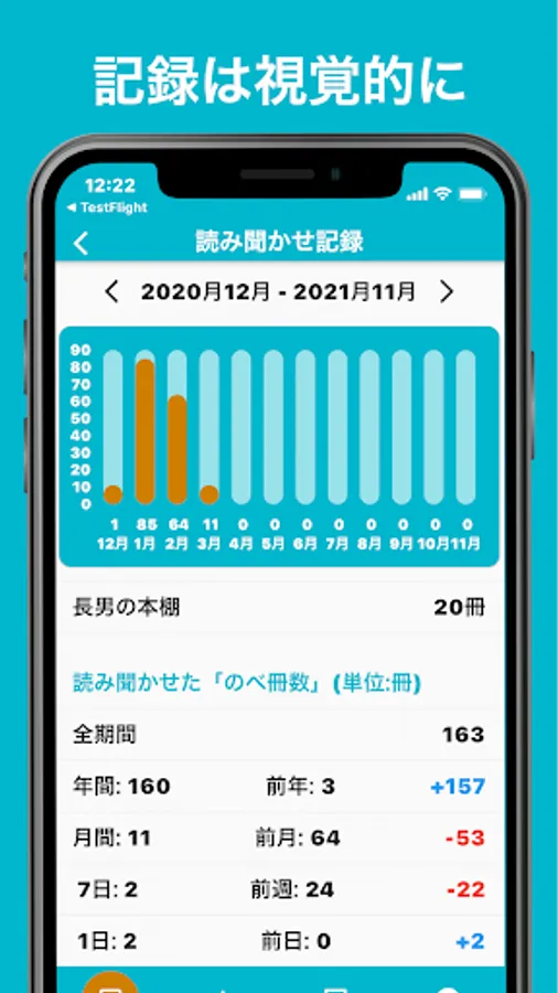 For each picture book, you can count the number of times you have read it just by pressing a button. In addition to simply counting, you can change the date by pressing and holding the reading button, and you can also take notes on 5 levels of playfulness, children's reactions, etc. Read aloud counts are aggregated and displayed in a chart.
