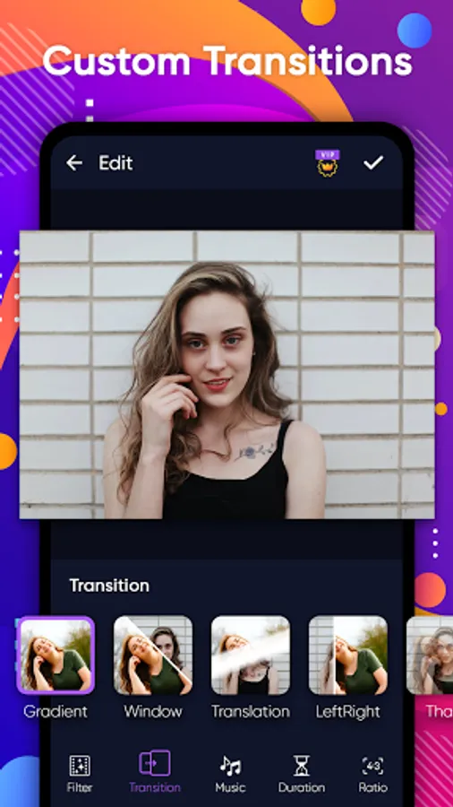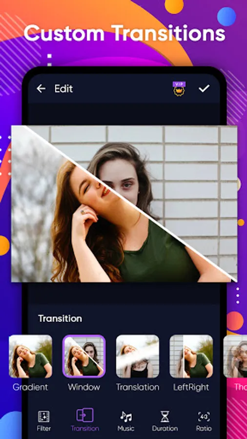 *60+ transitions are available in video editor app such as Fade in/out, Wash out, Iris in, Slice.