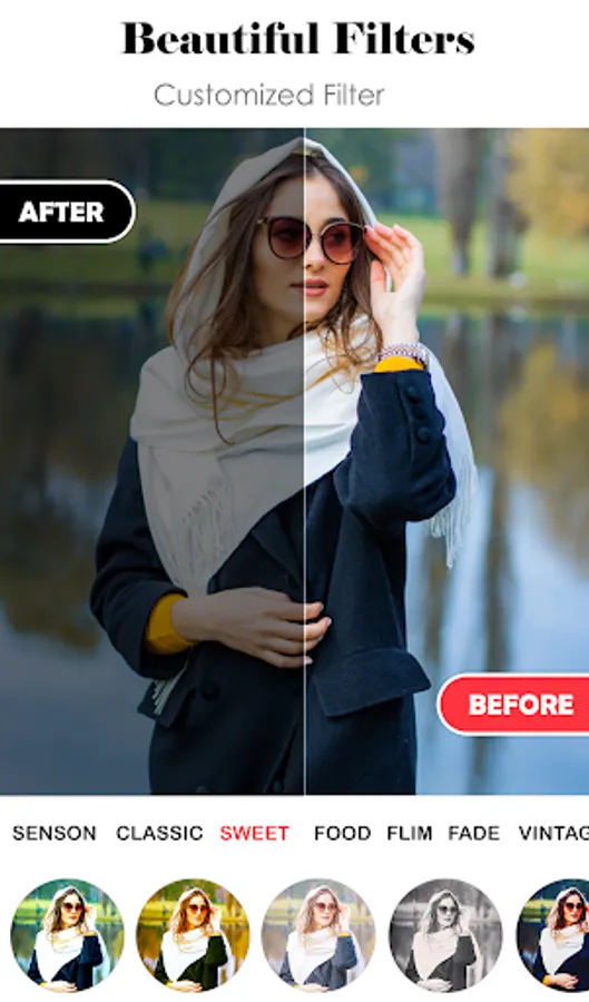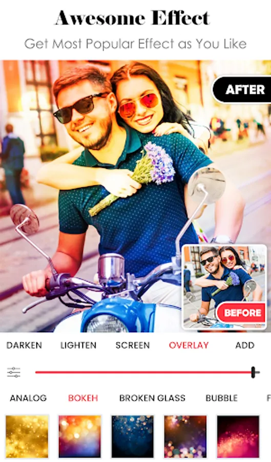 Here you can use multiple photo editing tools like, Awesome Stickers,Text tools, Blur photo, Flip photo, Beautiful Overlay Effects and many other options.