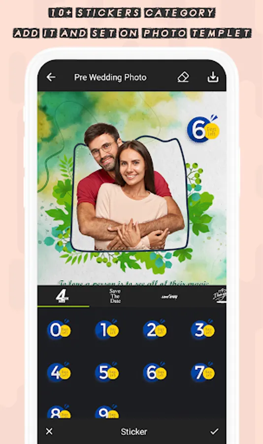 Various and lovely stickers.day countdown,7 day to go,6 day left, 5 day left,4 day to go,3 day to go, 2 day to go,1 day to go,Save the date,wedding day, love, couple,cake , ring,heart, wedding, etc…