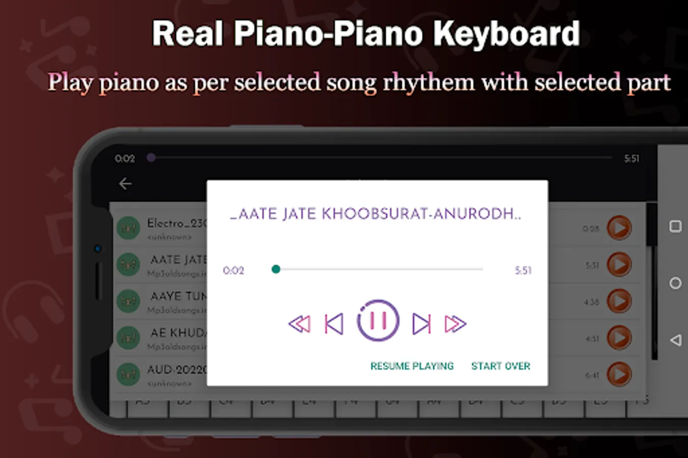 - Piano keyboard Slow or fast song at any time or pause it and start learning it note by note.