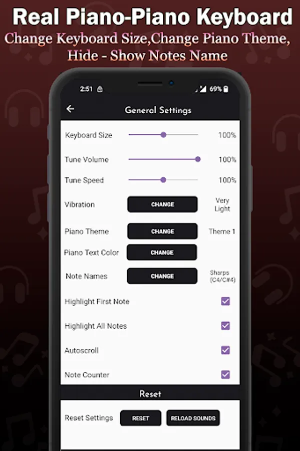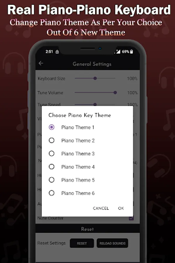 - Change Real Piano Play Keyboard theme out of 6 theme.