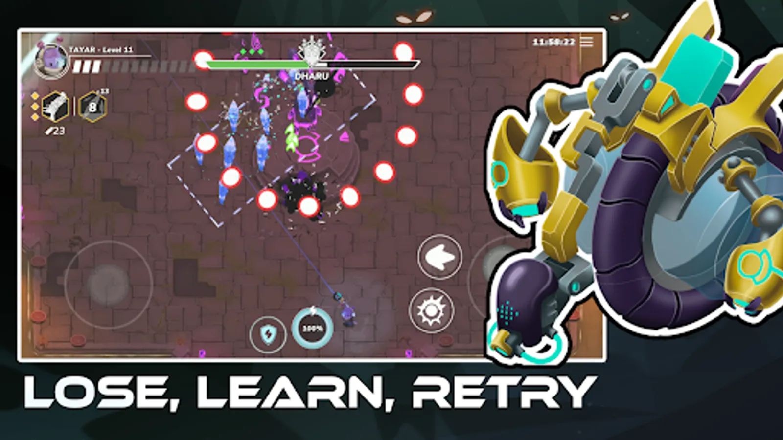 Choose the Bibot that will join Tayar in his epic journey, accumulate energy during your fights and use it to summon the devastating power of these mechanical beings. Each Bibot has its own playstyle and abilities, use them to fight your toughest enemies or save yourself from impossible situations. Learn to master them! The more you fight with the same Bibot, the more its synergy with Tayar will increase, unlocking new variants of its attacks to customize them before going into battle.