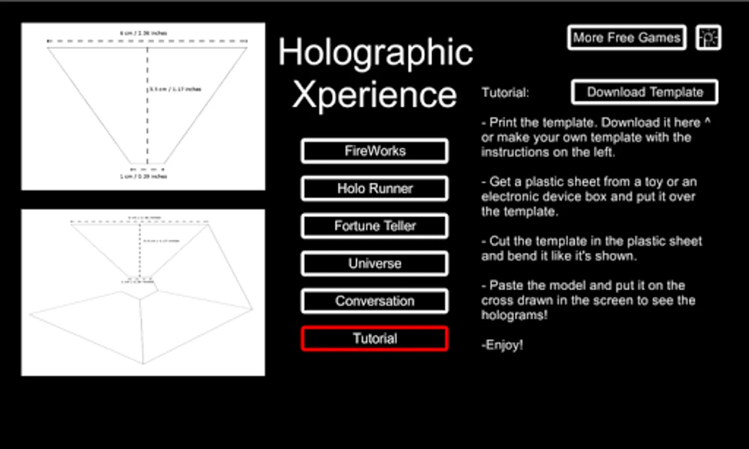 Go to https://drive.google.com/file/d/0B0S_V2pjOGfOal8tbjJib3Y5cmM/view?resourcekey=0-mRu9BtG51VSu75TXyZVM9Q, make your own pyramid and begin enjoying this app and its awesome real holograms that come out of the screen and impressing your friends. For a better experience play with a low light.