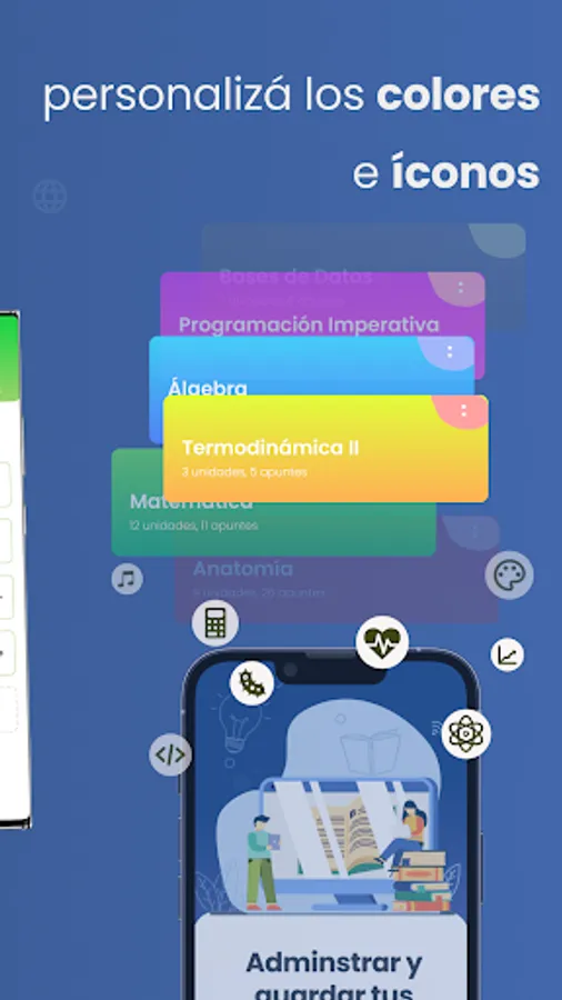 Con nuestra app, puedes capturar y almacenar fácilmente imágenes de tus apuntes y la pizarra de clase, asegurándote de que estén ordenadas y accesibles en todo momento. Personaliza tus materias con colores e iconos para distinguirlas visualmente y disfruta de una experiencia visual agradable y personalizada.