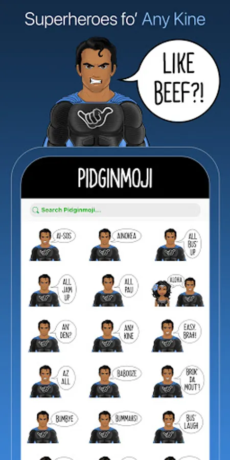 Pidginmoji Heroes provides unique, fun, stickers with a local flavor. These stickers are a great way to liven your texts with engaging and happy Pidgin phrases. Enrich your conversations with emoji that reflects the Hawaiian islands through the local language of Pidgin.