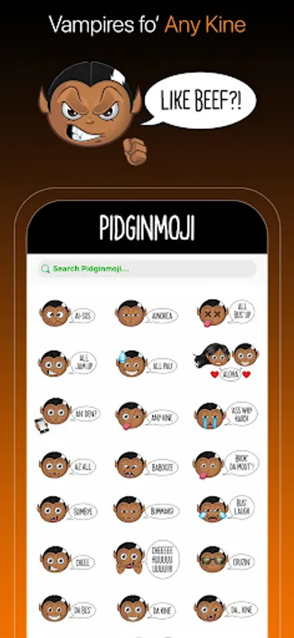 Pidginmoji Vampires provides unique, fun, stickers with a local flavor. These stickers are a great way to liven your texts with engaging and happy Pidgin phrases. Enrich your conversations with emoji that reflects the Hawaiian islands through the local language of Pidgin.