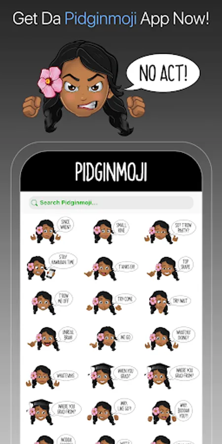 Pidginmoji provides unique, fun stickers with a local flavor. These stickers are a great way to liven your texts with entertaining and happy Pidgin phrases. Enrich your conversations with emoji that reflects the Hawaiian islands through the local language of Pidgin.
