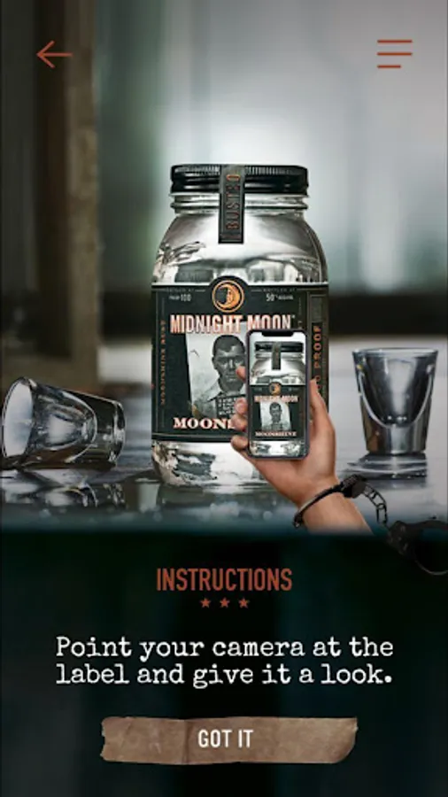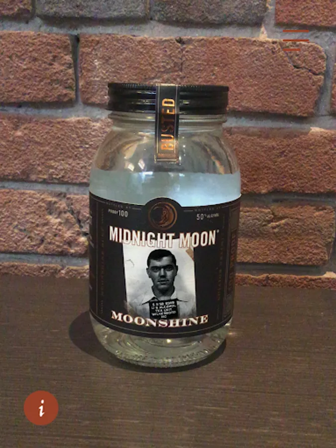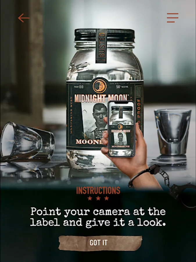 Once consumers download the dedicated app, they can point their phones at the special Midnight Moon moonshine bust label and hear Junior Johnson tell the story of his 1952 arrest. Sip responsibly. ©2019 Might Moon 100 Proof Original 50% ALC/VOL. Piedmont Distillers, Inc., Madison, NC. This content is intended only for those of the legal drinking age. Please do not share or forward this content with anyone under the legal drinking age.