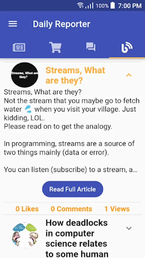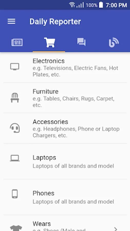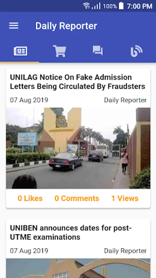 Daily Reporter is a multi-platform application that provides Nigerian students in higher institutions with quality news and updates about the happenings within their school and others. It also provides a quiz room, where students from the schools which Daily Reporter covers, can compete by providing answers to questions, emerge as winners and get a reward. Questions asked are from several fields. It also provides articles weekly. It also provides an online market where students can buy and sell items within their school.