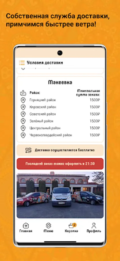 We deliver food in Donetsk and Makeyevka absolutely free of charge from 59 minutes.