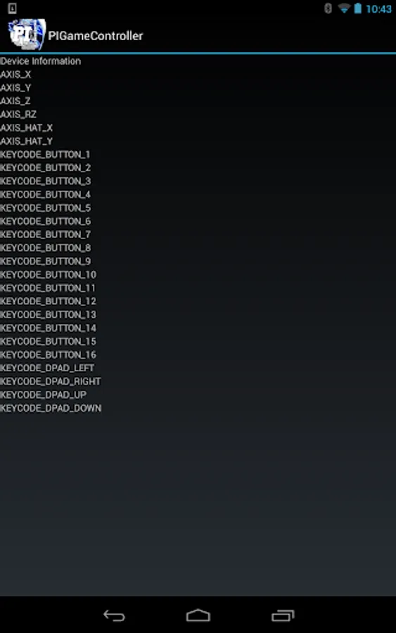PIGameController is a test or example app that displays the data from any game controller. Similar to other apps available, but includes buttons as well as some device adding/removing features. Requires Honeycomb (3.1) or newer.