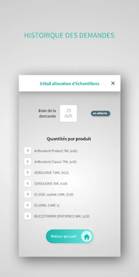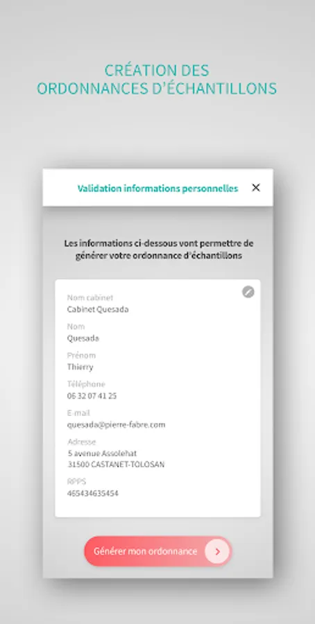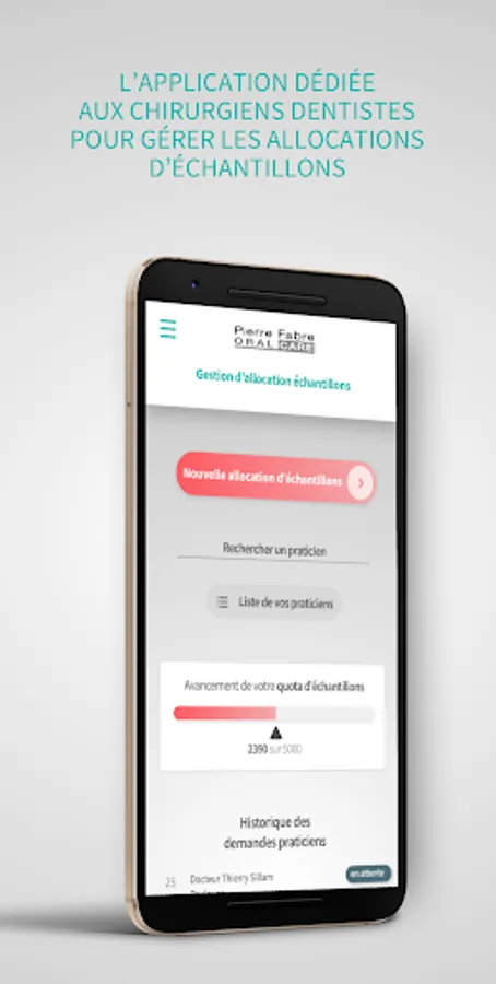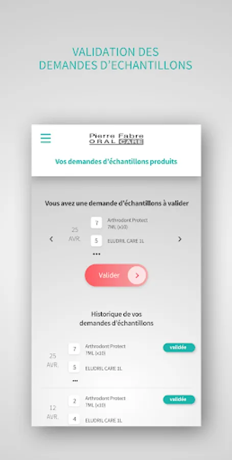 Application allowing the obtaining of samples with cosmetic status and / or medical device according to the regulations in force, following the sending by the health professional of a prescription at the headquarters of Pierre Fabre Oral Care via this application.
