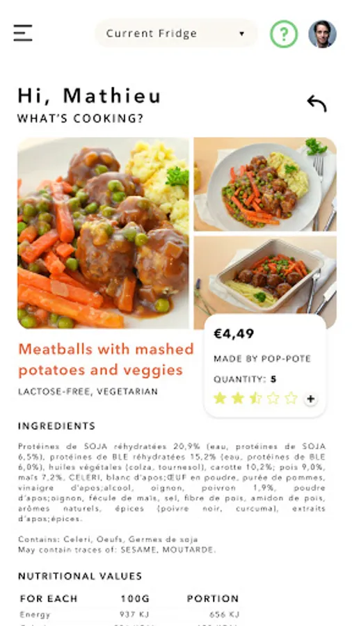 The list of products contained in the selected refrigerator is displayed. Their price and nutritional information as well.