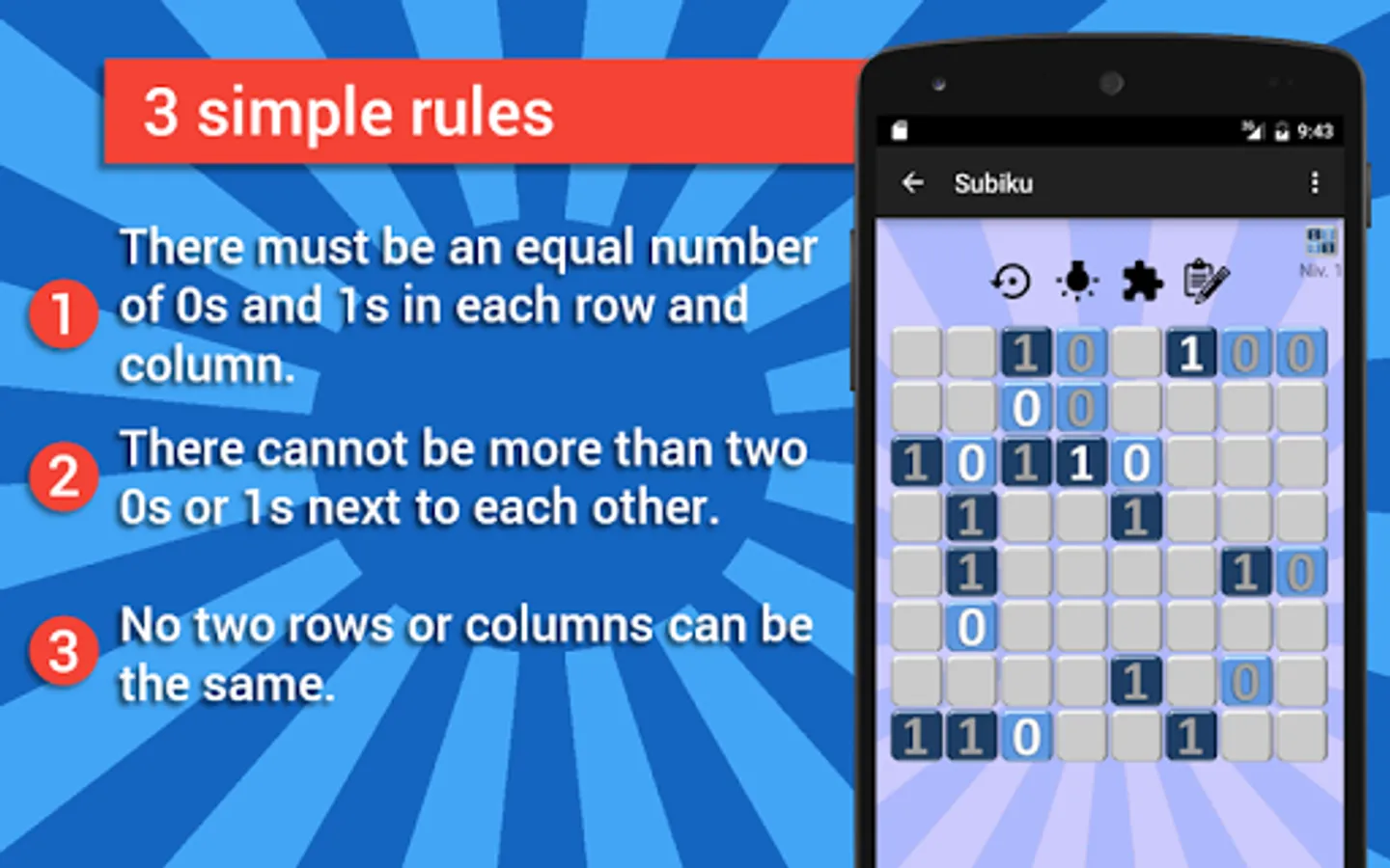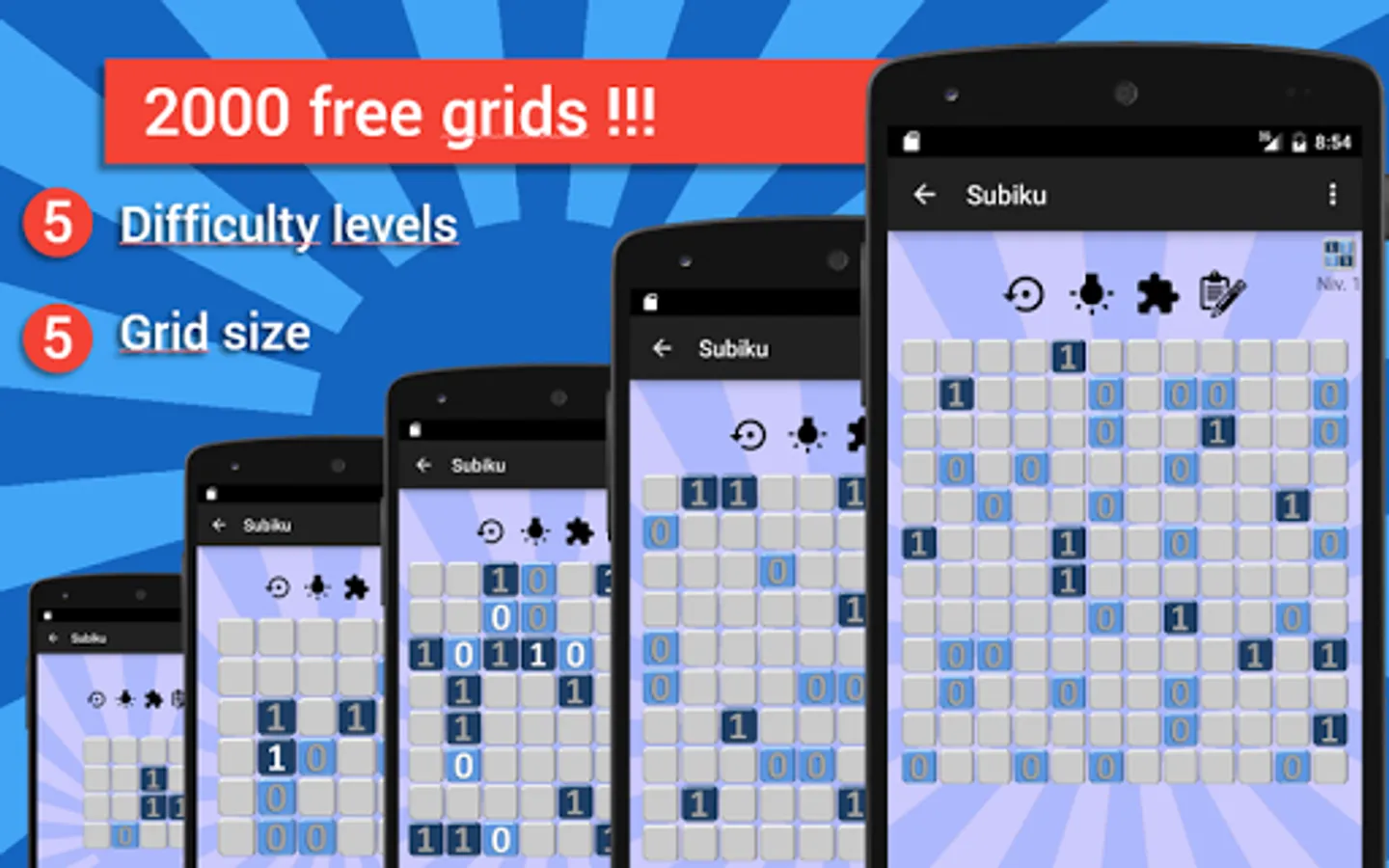 The Subiku is a number puzzle game that follows the same logic as Sudoku, Takuzu, the picross, or the 2048. Faster than a Sudoku, the grid can be complete in less than 5min.