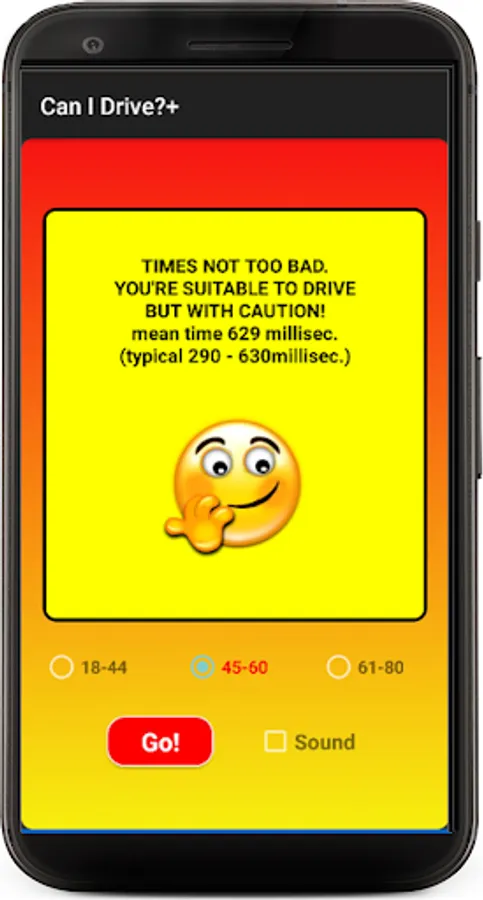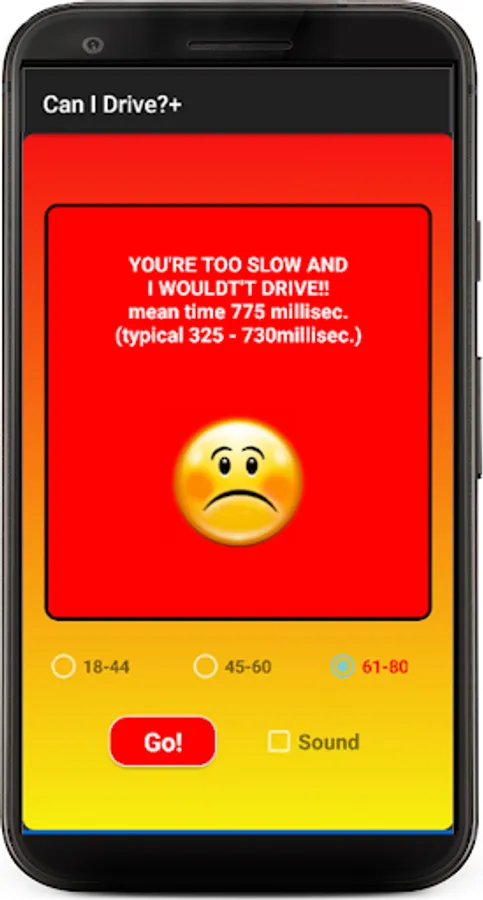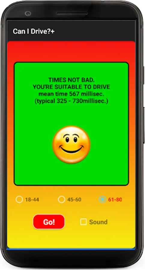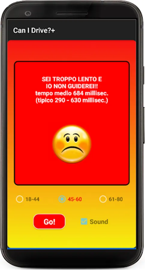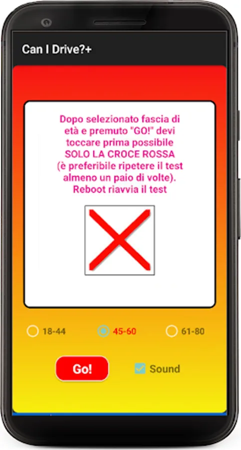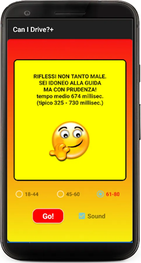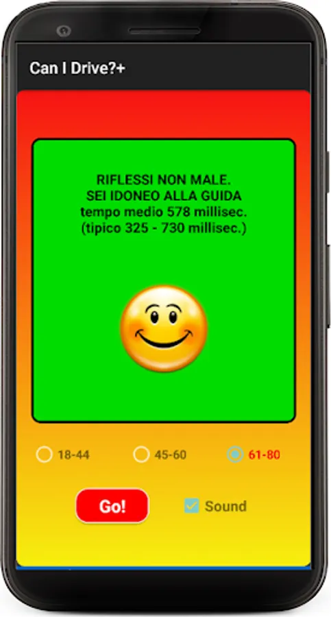Medicines, stress, mental and/or physical fatigue, pathologies, use of alcohol and drugs are known to have a negative and often decisive effect on reaction times to visual stimuli and therefore on fitness to drive. This app, which reproduces as much as possible a classic test taken from scientific literature (“Four Choice Reaction Time”), is intended to be a useful aid to decide, in the event of uncertainty, whether or not it is appropriate to drive in some particular situations.