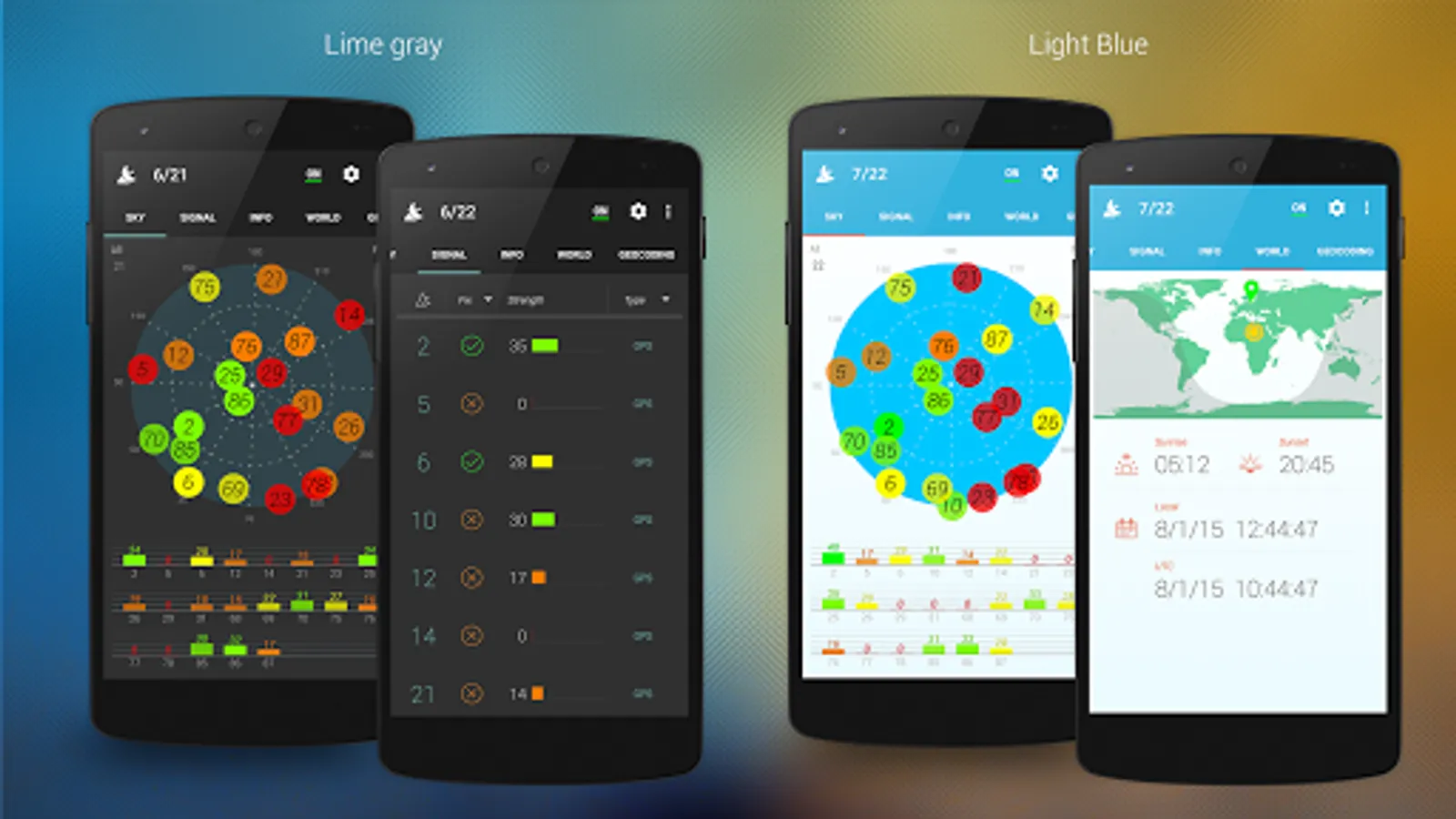 1) Sky tab + signal view – sky map view presents position of satellites connected with device on the sky. Each small circle represents one satellite with color adequate to signal strength and gps status. Signal strength view presents strength chart of satellites connected with device. Each bar is one satellite, height of the bar is proportional to received signal strength.