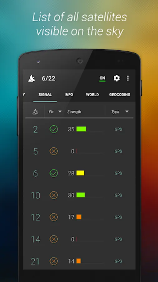 2) Signal tab – list of all satellites connected with device. Each row represents one satellite. You get all details about satellite prn number, info about satellite fix, signal strength and type: NAVSTAR, GLONASS, QZSS, Galileo, BeiDou, NavIC. Elevation and altitude