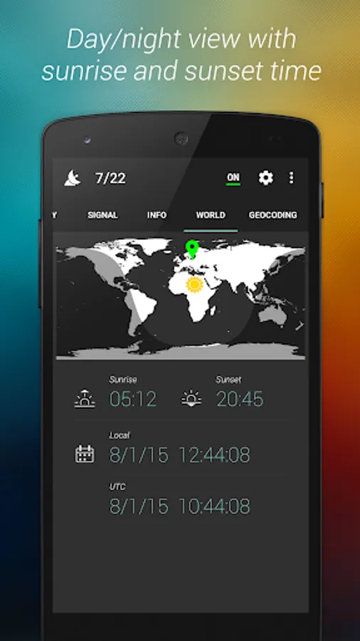 4) World tab – world map view presents position of the device, it also shows global sun position and day-light/night-dark area. There is local and UTC date time from GPS, also time of the sunrise and sunset are available.